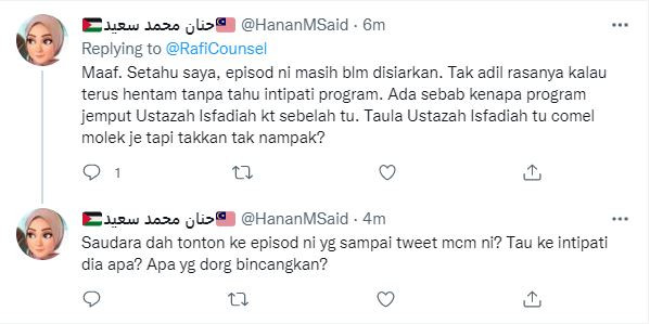 “Tk adil terus dihntam” Namun begitu, sehingga setakat ini belum keluar sebarang maklum balas daripada pihak stesen TV berkenaan berhubung isu yang tular. Malah, ada yang mengatakan bahawa siaran tersebut masih belum ditayangkan selain merasakan is tdak adil untuk pihak di luar sana menghe, ntam stesen TV itu.